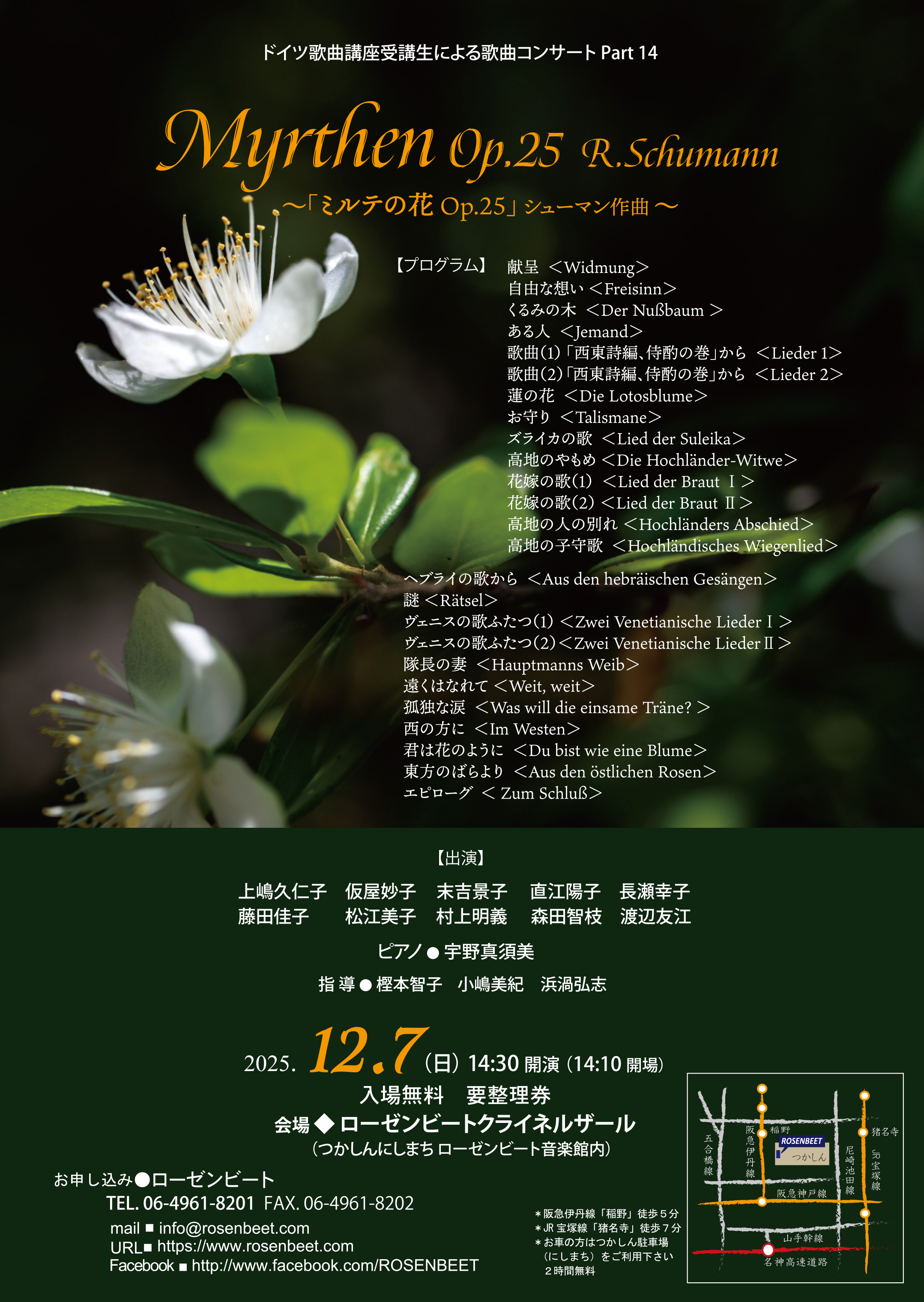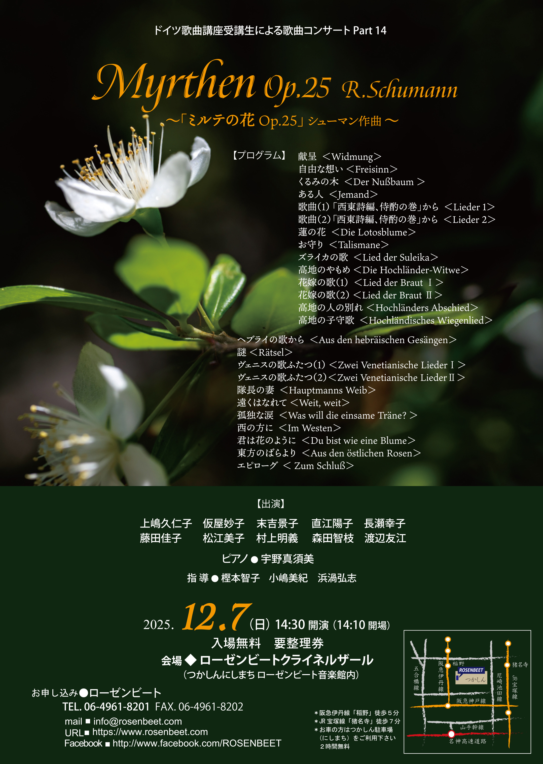 シューベルト、シューマン、R.シュトラウス、ブラームスほか巨匠たちの作品を通して、魅力溢れるドイツリートの世界を探求しましょう。受講生による歌曲集のリレーコンサートも定期的に催します。